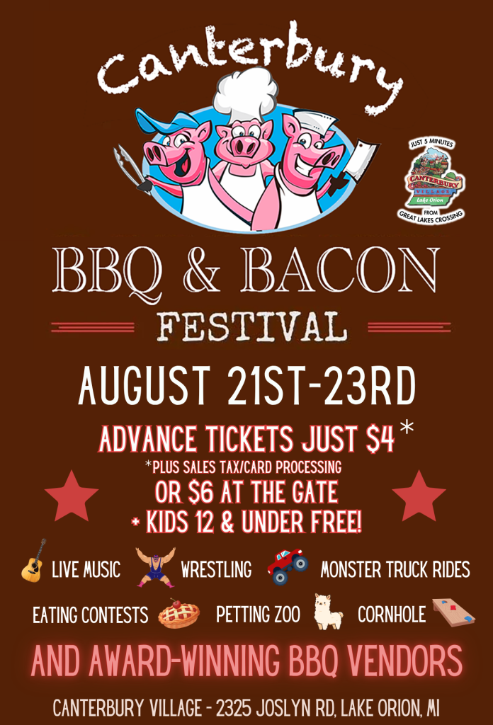 📍 Canterbury Village is located in Lake Orion, MI – just 40 minutes north of Detroit and 5 minutes from Great Lakes Crossing Outlets. Don’t miss Michigan’s tastiest summer tradition – now even better with bacon on the menu! 🥓🎉