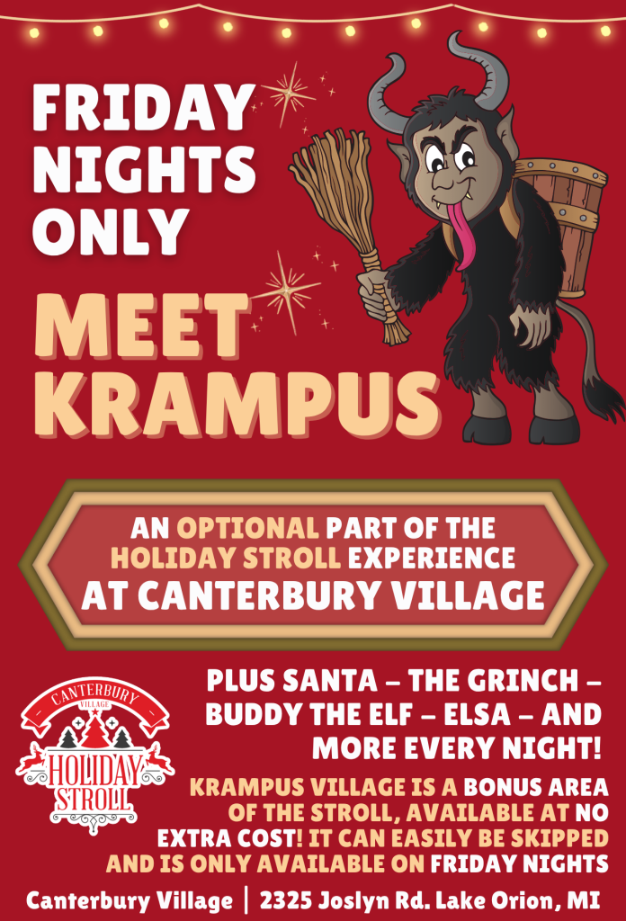 NEW for 2025 – FRIDAY NIGHTS ONLY: Meet KRAMPUS! The official holiday fiend (old friend of St. Nick’s that he is!) will be visiting during Stroll on Friday nights exclusively! This portion of the Stroll is OPTIONAL and is offered at NO ADDITIONAL CHARGE. Families on the path will be able to choose whether they wish to stroll through this darker side of the season or keep on walking the regular trail!