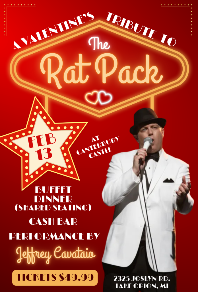 Enjoy a buffet-style Valentine’s dinner with shared seating, perfect for couples and friends alike, followed by a live tribute performance honoring the legendary Rat Pack. Set the mood with the sounds of Jeffrey Cavataio, a classy modern-day crooner with an upbeat pop twist.