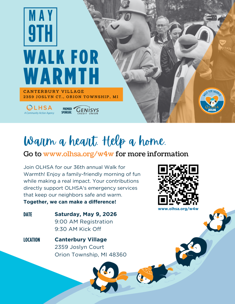 Join OLHSA (Oakland Livingston Human Service Agency) for a family-friendly morning at their 36th annual Walk for Warmth! Have fun while making a real impact! Contributions to Walk for Warmth support emergency services provided by OLHSA that help keep our neighbors safe and warm. Volunteer and sponsorship opportunities are available!